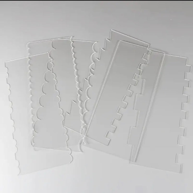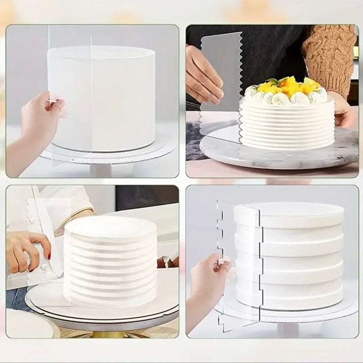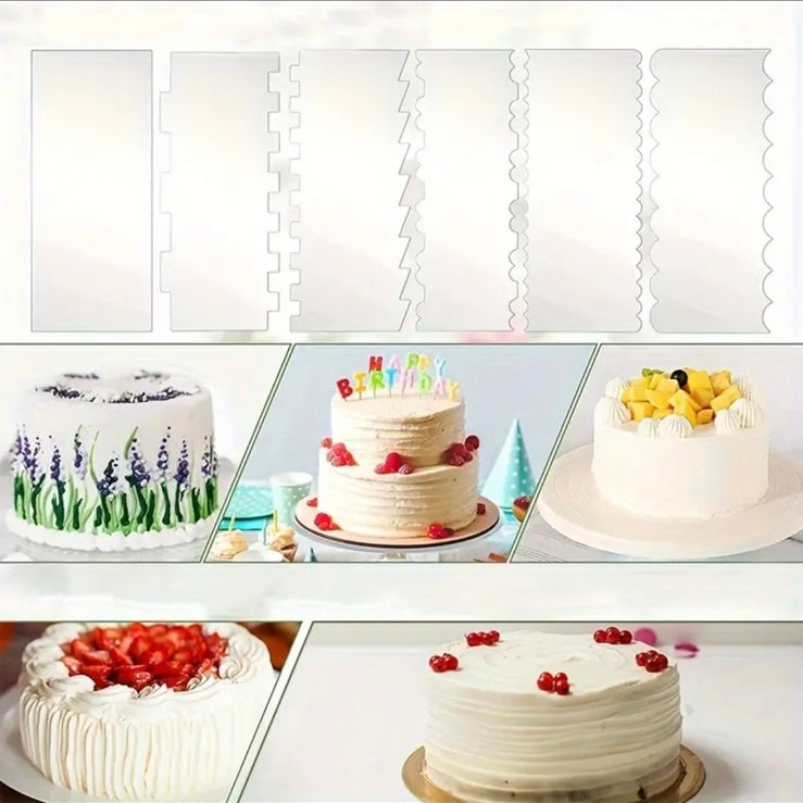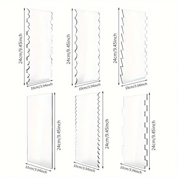 Ten zestaw skrobaków do wygładzania tortów zawiera 6 różnych wzorów krawędzi – w tym gładkie i prążkowane.