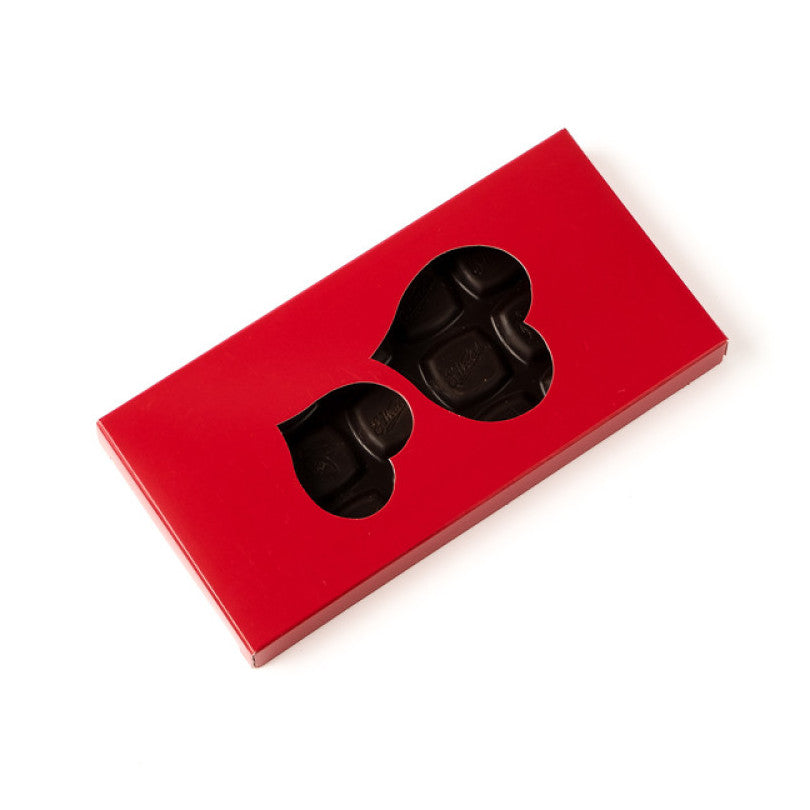 Eleganckie czerwone pudełko kartonowe z dekoracyjnym okienkiem w kształcie serc, przeznaczone do pakowania ręcznie robionych tabliczek czekolady. Idealne dla cukierni, manufaktur czekolady oraz opakowań sprzedażowych i prezentowych.